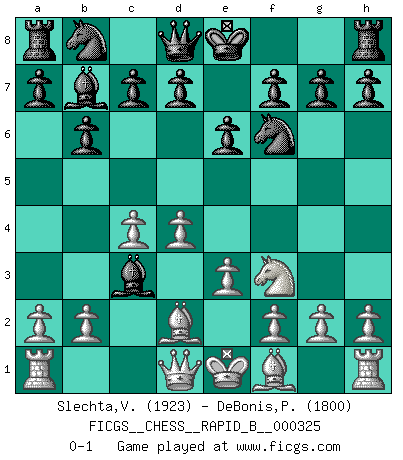 Last move : 0-1 2019 October 13 8:42:35 [Event "FICGS__CHESS__RAPID_B__000325"] [Site "FICGS"] [Date "2019.09.03"] [Round "1"] [White "Slechta,Vladimir"] [Black "DeBonis,Patrick"] [Result "0-1"] [WhiteElo "1923"] [BlackElo "1800"] 1.d4 Nf6 2.c4 e6 3.Nc3 Bb4 4.Bd2 b6 5.e3 Bb7 6.Nf3 Bxc3 0-1 This chess game has been lost on time (started : 2019.09.03 22:45:4) Nimzo-Indian defense Player Black won this chess game. Follow this game move after move (download)Fischer Chess play was always razor-sharp, rational and brilliant. One of the best ever. (Dave Regis) Der Bart als Geschlechtszeichen mitten im Gesicht ist obszön. Daher gefällt er den Weibern. [Zugegeben, kein Schachzitat, aber unglaublich originell] (Arthur Schopenhauer) El Ajedrez es una hermosa aventura. (Bent Larsen) J'apprécie les joueurs d'est-indienne, c'est grâce à eux que je nourris ma famille depuis tant d'années. (Petrosian) I'll be back. (Arnold Schwarzenegger)