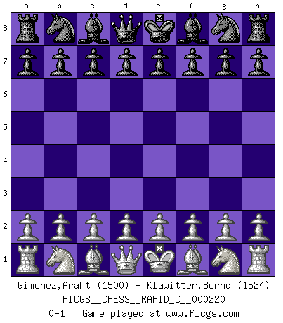 Last move : 0-1 2019 October 9 13:4:42 [Event "FICGS__CHESS__RAPID_C__000220"] [Site "FICGS"] [Date "2019.09.09"] [Round "1"] [White "Gimenez,Araht"] [Black "Klawitter,Bernd"] [Result "0-1"] [WhiteElo "1500"] [BlackElo "1524"] 0-1 This chess game has been lost on time (started : 2019.09.09 8:30:3) Player Black won this chess game. Follow this game move after move (download)That's what Chess is all about. One day you give your opponent a lesson, the next day he gives you one. (Bobby Fischer) Die Fehler sind da, Sie warten nur darauf gemacht zu werden. (Savielly Grigorievitsch Tartakower) Hay dos clases de hombres: aquellos que se conforman en dejarse llevar por las circunstancias y que juegan barajas y aquellos decididos a controlar las circunstancias y que juegan al Ajedrez. (Mortimer Collins) Les Echecs sont affaire de jugement sensible. Savoir quand frapper et quand esquiver. (Fischer) All the biggest technological inventions created by man - the airplane, the automobile, the computer - says little about his intelligence, but speaks volumes about his laziness. (Mark Kennedy)