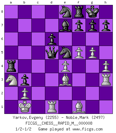 Last move : 1/2-1/2 2007 September 14 17:48:51 [Event "FICGS__CHESS__RAPID_M__000008"] [Site "FICGS"] [Date "2007.06.23"] [Round "1"] [White "Yarkov,Evgeny"] [Black "Noble,Mark"] [Result "1/2-1/2"] [WhiteElo "2255"] [BlackElo "2497"] 1.e4 c5 2.Nf3 d6 3.d4 cxd4 4.Nxd4 Nf6 5.Nc3 a6 6.Be3 e5 7.Nb3 Be6 8.f3 Be7 9.Qd2 O-O 10.O-O-O Nbd7 11.g4 b5 12.g5 b4 13.Ne2 Ne8 14.f4 a5 15.f5 a4 16.Nbd4 exd4 17.Nxd4 b3 18.Kb1 bxc2+ 19.Nxc2 Bb3 20.axb3 axb3 21.Na3 Ne5 22.h4 Ra4 23.Rh3 Qa8 24.Qd5 Qxd5 1/2-1/2 Sicilian : Najdorf, Byrne (English) attack Kingside Castling by player Black (move 9) Queenside Castling by player White (move 10) This chess game ended in a draw. Follow this game move after move (download)Adequate compensation for a sacrifice is having a sound combination leading to a winning position; adequate compensation for a blunder is having your opponent snatch defeat from the jaws of victory. (Bruce A. Moon) Die Arbeit ist etwas Unnatürliches. Die Faulheit allein ist göttlich. (Anatole France) La esencia del Ajedrez es pensar acerca de lo que el Ajedrez es. (David Bronstein) Tout change constamment, y compris dans le monde des Echecs. (Botvinnik) There is no instance of a country having benefited from prolonged warfare. (Sun Tzu)