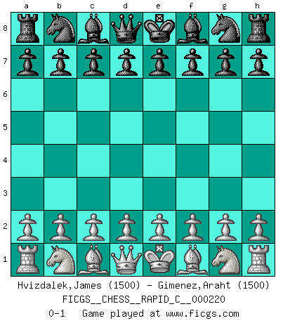Last move : 0-1 2019 October 9 13:4:42 [Event "FICGS__CHESS__RAPID_C__000220"] [Site "FICGS"] [Date "2019.09.09"] [Round "1"] [White "Hvizdalek,James"] [Black "Gimenez,Araht"] [Result "0-1"] [WhiteElo "1500"] [BlackElo "1500"] 0-1 This chess game has been lost on time (started : 2019.09.09 8:30:3) Player Black won this chess game. Follow this game move after move (download)If your opponent cannot do anything active, then don't rush the position; instead you should let him sit there, suffer, and beg you for a draw. (Jeremy Silman) In Buenos Aires ist es nicht mein vorrangiges Ziel ein starkes Turnier zu organisieren, sondern ein Turnier für Gentlemen. Ich würde nie Kamsky einladen. Ich mag keine Probleme. (Miguel Najdorf) La maestría del Ajedrez consiste esencialmente en analizar posiciónes de Ajedrez con precisión. (Mikhail Botvinnik) Les échecs, c'est la lutte contre l'erreur. (Johannes Zukertort) I couldn't make any sense out of what this particular thread is about. It sounds like R2 D2 computer speaking. A space fight ?!? Some 'command' problems in Moscow ? Some killers & narcotic addicts attacking some game & a god wannabe ?? (Dinesh De Silva, lost in a russian conflict in FICGS forum)