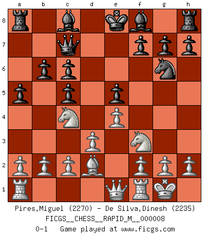 Last move : 0-1 2007 September 7 7:23:38 [Event "FICGS__CHESS__RAPID_M__000008"] [Site "FICGS"] [Date "2007.06.23"] [Round "1"] [White "Pires,Miguel"] [Black "De Silva,Dinesh"] [Result "0-1"] [WhiteElo "2270"] [BlackElo "2235"] 1.e4 c5 2.Nf3 Nc6 3.Bb5 a6 4.Bxc6 dxc6 5.O-O Qc7 6.d3 e5 7.Nbd2 Ne7 8.Nc4 Ng6 9.Bd2 a5 10.Qe1 b6 0-1 This chess game has been lost on time (started : 2007.06.23 16:10:23) Sicilian : Nimzovich-Rossolimo attack (without ...d6) Kingside Castling by player White (move 5) Player Black won this chess game. Follow this game move after move (download)A thorough understanding of the typical mating continuations makes the most complicated sacrificial combinations leading up to them not only not difficult, but almost a matter of course. (Siegbert Tarrasch) Gewinnen beim Schach fördert das Selbstvertrauen. Beim Sex spüre ich sowas nicht... (Garry Kasparov) Muchos se han convertido en Maestros de Ajedrez, nadie se ha convertido en el Maestro del Ajedrez. (Siegbert Tarrasch) Votre seul travail dans les ouvertures est d'obtenir un milieu de partie jouable. (Lajos Portish) The absolute truth is the thing that makes people laugh. (Carl Reiner)