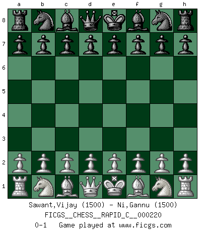 Last move : 0-1 2019 October 9 13:4:42 [Event "FICGS__CHESS__RAPID_C__000220"] [Site "FICGS"] [Date "2019.09.09"] [Round "1"] [White "Sawant,Vijay"] [Black "Ni,Gannu"] [Result "0-1"] [WhiteElo "1500"] [BlackElo "1500"] 0-1 This chess game has been lost on time (started : 2019.09.09 8:30:3) Player Black won this chess game. Follow this game move after move (download)You can only get good at Chess if you love the game. (Bobby Fischer) Man braucht nicht immer den besten Zug zu spielen: Ein Zug muß aktiv, unternehmungslustig, korrekt und schön sein. (David Bronstein) Fischer no está bajo la obligación de nadie. (Joseph Platz) Les échecs sont un jeu terrible. Si vous n'avez pas le centre, votre adversaire a une position plus libre. Par contre, si vous avez le centre, alors vous avez vraiment quelque chose pour laquelle vous inquiéter ! (Siegbert Tarrasch) You think that education is too expensive ? Try ignorance. (Derek Bok)