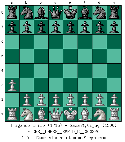 Last move : 1-0 2019 October 9 13:4:42 [Event "FICGS__CHESS__RAPID_C__000220"] [Site "FICGS"] [Date "2019.09.09"] [Round "1"] [White "Trigance,Emile"] [Black "Sawant,Vijay"] [Result "1-0"] [WhiteElo "1716"] [BlackElo "1500"] 1.a3 1-0 This chess game has been lost on time (started : 2019.09.09 8:30:3) Anderssen's Opening Player White won this chess game. Follow this game move after move (download)Only sissies Castle. (Rob Sillars) Über Karpov: Er war und ist ein Vertreter der russischen Reaktionäre. Das steckt tief in seiner Seele, wehalb ich nicht nett mit ihm umgehen kann. (Viktor Kortschnoi) Hoy en día, si tu no eres un Gran Maestro a los 14 años, es mejor que lo olvides. (Anand Viswanathan) C'est une question de caractère, Beaucoup de gens perdent leur motivation très vite. D'autres, ils sont rares, peuvent la conserver très longtemps. J'aime les échecs, encore aujourd'hui je suis heureux d'analyser des parties. J'aime toujours gagner, je déteste encore perdre. Bien jouer est important pour mon intégrité intellectuelle et morale. Et puis les échecs vivent en ce moment une période historique grâce à Internet. Ils se développent dans les systèmes éducatifs à travers le monde. Ils sortent de leur ghetto, et c'est mon rôle de mener à bien cette révolution. (Gary Kasparov) Life is pleasant. Death is peaceful. It's the transition that's troublesome. (Isaac Asimov)