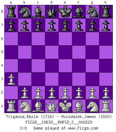 Last move : 1-0 2019 October 9 13:4:42 [Event "FICGS__CHESS__RAPID_C__000220"] [Site "FICGS"] [Date "2019.09.09"] [Round "1"] [White "Trigance,Emile"] [Black "Hvizdalek,James"] [Result "1-0"] [WhiteElo "1716"] [BlackElo "1500"] 1.a3 1-0 This chess game has been lost on time (started : 2019.09.09 8:30:3) Anderssen's Opening Player White won this chess game. Follow this game move after move (download)A strong memory, concentration, imagination, and a strong will is required to become a great Chess player. (Bobby Fischer) Den Ruhm habe ich schon, jetzt brauche ich noch das Geld. (Wilhelm Steinitz) El ganar no lo es todo... pero el perder es nada. (Mednis) La conception d'un plan est le processus par lequel un joueur exploite les avantages de sa position tout en s'efforçant d'en réduire au minimum les inconvénients. Afin de garantir le succès, un plan doit toujours se fonder sur un diagnostic objectif des particularités d'une position. La conception d'un plan est d'autant plus difficile que la position est équilibrée, et grandement facilitée lorsqu'il n'existe qu'un seul plan susceptible de répondre aux exigences de la position. (Harry Golombek) Unless in communicating with it one says exactly what one means, trouble is bound to result. (Alan Turing, about computers)