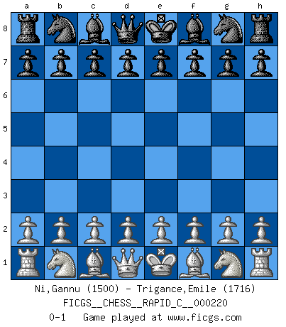 Last move : 0-1 2019 October 9 13:4:42 [Event "FICGS__CHESS__RAPID_C__000220"] [Site "FICGS"] [Date "2019.09.09"] [Round "1"] [White "Ni,Gannu"] [Black "Trigance,Emile"] [Result "0-1"] [WhiteElo "1500"] [BlackElo "1716"] 0-1 This chess game has been lost on time (started : 2019.09.09 8:30:3) Player Black won this chess game. Follow this game move after move (download)Life is like a game of Chess, changing with each move. (Chinese proverb) Ein Springer auf f6 gegen die eigene Rochadestellung ist schlimmer als ein rostiger Nagel im Knie. (Efim Bogoljubov) El Ajedrez detiene a su maestro dentro de sus propios vínculos, encadenando la mente y el cerebro, por lo que la libertad interior del mas fuerte debe sufrir. (Albert Einstein) La solitude du joueur d'Echecs à l'approche du mat est semblable à celle du condamné. (Francis Szpiner) I live to kill Traxler counterattack. (Ilmars Cirulis)