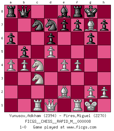 Last move : 1-0 2007 September 2 18:52:54 [Event "FICGS__CHESS__RAPID_M__000008"] [Site "FICGS"] [Date "2007.06.23"] [Round "1"] [White "Yunusov,Adkham"] [Black "Pires,Miguel"] [Result "1-0"] [WhiteElo "2394"] [BlackElo "2270"] 1.e4 c5 2.c3 d6 3.d4 cxd4 4.cxd4 Nf6 5.Nc3 g6 6.Nf3 Bg7 7.Be2 O-O 8.O-O Nc6 9.d5 Nb4 10.Be3 Na6 11.Rc1 Bd7 12.Nd2 Nc7 13.b4 a6 14.Bb6 Qc8 15.a4 Qb8 16.Nc4 Be8 17.f4 Nd7 18.Bd4 b5 19.Bxg7 1-0 This chess game has been lost on time (started : 2007.06.23 16:10:23) Sicilian : Alapin's variation (2.c3) Kingside Castling by player Black (move 7) Kingside Castling by player White (move 8) Player White won this chess game. Follow this game move after move (download)You know, comrade Pachman, I don't enjoy being a Minister, I would rather play Chess like you. (Che Guevara) Wie, soll nun auch die Opposition abgeschafft werden? Ja, es tut mir leid, Ihnen diesen Schmerz nicht ersparen zu können. (Aaron Nimzowitsch) Las combinaciones han sido siempre el aspecto más intrigante del Ajedrez. Los Maestros las buscan, el público las aplauden, los críticos las alaban. La razón se debe a que las combinaciones hacen posible que el Ajedrez sea más que un ejercicio matemático con una carencia de vida. Ellas son la poesía del juego, son del Ajedrez lo que la melodía es de la música. Ellas representan el triunfo de la mente sobre la materia. (Reuben Fine) Des idées, des idées, j'en ai cent, j'en ai mille. Des bonnes, des mauvaises, applicables, irréalisables... Il suffit de faire le tri ! (Roos) Watch your thoughts; they become words. Watch your words; they become actions. Watch your actions; they become habits. Watch your habits; they become character. Watch your character; it becomes your destiny. (Frank Outlaw)