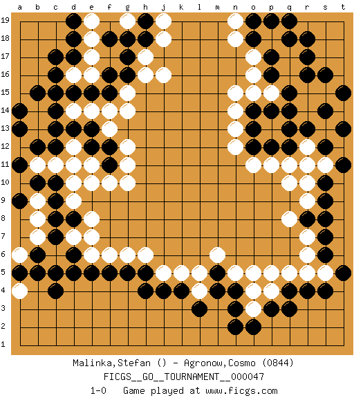 Last move : 1-0 2020 January 20 23:50:57 [Event "FICGS__GO__TOURNAMENT__000047"] [Site "FICGS"] [Date "2019.09.11"] [Round "1"] [Black "Malinka,Stefan"] [White "Agronow,Cosmo"] [Result "1-0"] [Rating 2 "0844"] 1.q4 d16 2.c4 r15 3.c14 d14 4.d13 r6 5.r8 q8 6.r13 q13 7.q12 p13 8.p12 n12 9.o13 n15 10.o12 o11 11.o14 o15 12.q14 j16 13.d15 e14 14.c16 e10 15.d8 d10 16.e15 g14 17.f15 f14 18.d17 p15 19.p14 q10 20.e13 g12 21.f11 g10 22.f12 f10 23.k4 o5 24.r4 o3 25.q3 s5 26.s4 l5 27.l3 j5 28.j4 k5 29.h4 g6 30.f5 e6 31.d6 d7 32.c7 e7 33.c9 g15 34.g16 h16 35.g17 j18 36.h18 h17 37.h19 j19 38.f18 r11 39.s12 s11 40.t11 r14 41.s10 r10 42.s9 r12 43.s14 f13 44.e12 c13 45.c12 b13 46.b12 b14 47.c15 d11 48.b15 b11 49.a13 d12 50.b10 c11 51.a14 g11 52.e5 f6 53.q15 q16 54.r16 n13 55.r17 q17 56.q18 p18 57.r18 s15 58.s16 n14 59.q13 q11 60.n3 o4 61.o2 q5 62.p3 p4 63.s7 r7 64.s6 r5 65.t5 r9 66.s8 t14 67.t15 p19 68.n4 n5 69.m5 m6 70.m4 e11 71.c13 t12 72.t13 e8 73.h5 h6 74.g5 l4 75.n2 p5 76.q19 p11 77.p17 o17 78.p16 o16 79.o18 n18 80.o19 n19 81.a11 d9 82.c8 g19 83.g18 p18 84.p19 c6 85.d5 b8 86.b6 b7 87.c10 b9 88.c5 a10 89.a9 e18 90.d18 e17 91.f16 a6 92.a5 e19 93.d19 e16 94.c17 a4 95.b5 1-0 Here are the names of the openings (joseki) played in the four corners : Corner d16 : d16 c14 Hoshi (Hwajeom, Seongjeom, Xingwei`) 4-4 Point. The star or hoshi (4-4) point, emphasizing influence at the potential expense of territory. Ikken Kakari (Hankan Keolch'im, Yi Gua`jiao~, 1-Space Low Approach). Black 2 is the standard approach move to the 4-4. Corner q4 : q4 r6 Hoshi (Hwajeom, Seongjeom, Xingwei`) 4-4 Point. The star or hoshi (4-4) point, emphasizing influence at the potential expense of territory. Ikken Kakari (Hankan Keolch'im, Yi Gua`jiao~, 1-Space Low Approach). White 2 is the standard approach move to the 4-4. Corner q16 : r15 r13 Mokuhazushi (Waemok, Wai`mu`) 5-3 Point. The mokuhazushi (5-3) point was popular in the Edo period in Japan (1600 - 1867). It emphasizes influence; territorially, it is inferior to the 3-4 point. Player Black won this Go (weiqi, baduk) game. Follow this game move after move (download)You can hide nothing on the goban. (Pierre Audouard) Horse racing is animated roulette. (Roger Kahn)