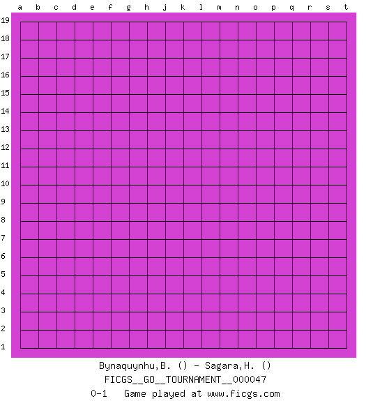 Last move : 0-1 2019 October 12 4:19:33 [Event "FICGS__GO__TOURNAMENT__000047"] [Site "FICGS"] [Date "2019.09.11"] [Round "1"] [Black "Bynaquynhu,Bynaquynhu"] [White "Sagara,Hao"] [Result "0-1"] 0-1 This go game has been lost on time (started : 2019.09.11 22:5:5) Here are the names of the openings (joseki) played in the four corners : Player White won this Go (weiqi, baduk) game. Follow this game move after move (download)There is no territory in the centre. (Anonymous) The real danger is not that computers will begin to think like men, but that men will begin to think like computers. (Sydney J. Harris)