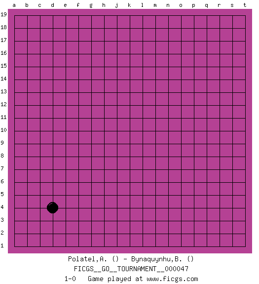 Last move : 1-0 2019 October 13 8:42:35 [Event "FICGS__GO__TOURNAMENT__000047"] [Site "FICGS"] [Date "2019.09.11"] [Round "1"] [Black "Polatel,Ali"] [White "Bynaquynhu,Bynaquynhu"] [Result "1-0"] 1.d4 1-0 This go game has been lost on time (started : 2019.09.11 22:5:5) Here are the names of the openings (joseki) played in the four corners : Corner d4 : d4 1-0 Hoshi (Hwajeom, Seongjeom, Xingwei`) 4-4 Point. The star or hoshi (4-4) point, emphasizing influence at the potential expense of territory. Player Black won this Go (weiqi, baduk) game. Follow this game move after move (download)Don't make empty triangles. (Anonymous) May I never be complete. May I never be content. May I never be perfect. Deliver me, Tyler, from being perfect and complete. (Chuck Palahniuk, Fight Club)