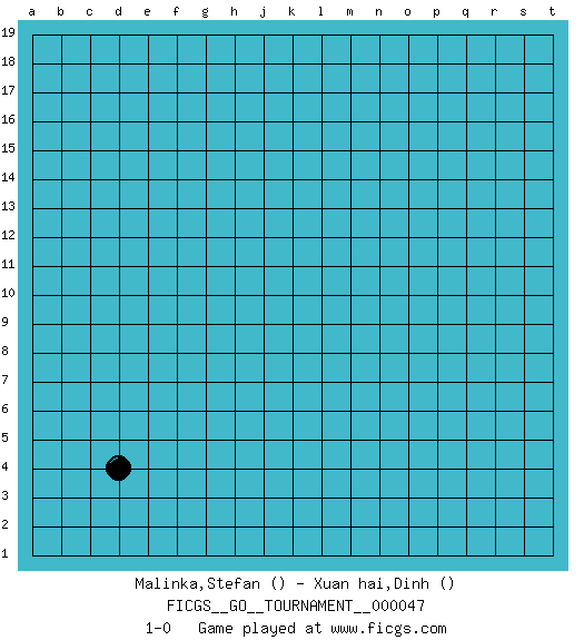 Last move : 1-0 2019 October 13 8:42:35 [Event "FICGS__GO__TOURNAMENT__000047"] [Site "FICGS"] [Date "2019.09.11"] [Round "1"] [Black "Malinka,Stefan"] [White "Xuan hai,Dinh"] [Result "1-0"] 1.d4 1-0 This go game has been lost on time (started : 2019.09.11 22:5:5) Here are the names of the openings (joseki) played in the four corners : Corner d4 : d4 1-0 Hoshi (Hwajeom, Seongjeom, Xingwei`) 4-4 Point. The star or hoshi (4-4) point, emphasizing influence at the potential expense of territory. Player Black won this Go (weiqi, baduk) game. Follow this game move after move (download)If White takes all four corners, Black should resign; if Black takes all four corners, Black should also resign. (David Kent) Warrior pose battles inner weakness and wins focus. You see that there is no war within you. You're on your own side, and you are your own strength. (Terri Guillemets)
