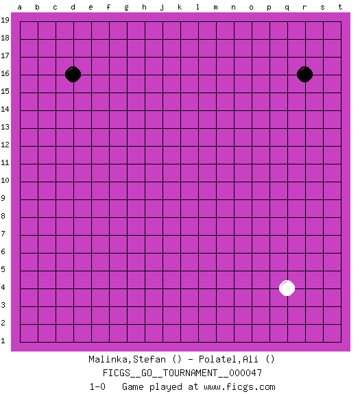 Last move : 1-0 2019 October 15 0:2:22 [Event "FICGS__GO__TOURNAMENT__000047"] [Site "FICGS"] [Date "2019.09.11"] [Round "1"] [Black "Malinka,Stefan"] [White "Polatel,Ali"] [Result "1-0"] 1.d16 q4 2.r16 1-0 This go game has been lost on time (started : 2019.09.11 22:5:5) Here are the names of the openings (joseki) played in the four corners : Player Black won this Go (weiqi, baduk) game. Follow this game move after move (download)While the Baroque rules of chess could only have been created by humans, the rules of go are so elegant, organic, and rigorously logical that if intelligent life forms exist elsewhere in the universe, they almost certainly play go. (Edward Lasker, international chess master) I find your interest interesting. (Gregory House, House M.D.)