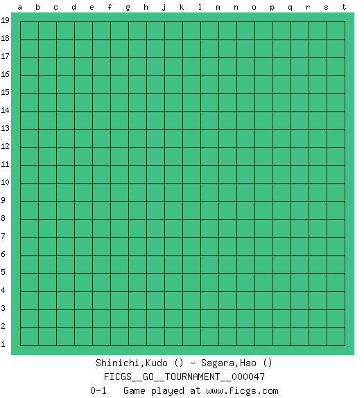Last move : 0-1 2019 October 12 4:19:33 [Event "FICGS__GO__TOURNAMENT__000047"] [Site "FICGS"] [Date "2019.09.11"] [Round "1"] [Black "Shinichi,Kudo"] [White "Sagara,Hao"] [Result "0-1"] 0-1 This go game has been lost on time (started : 2019.09.11 22:5:5) Here are the names of the openings (joseki) played in the four corners : Player White won this Go (weiqi, baduk) game. Follow this game move after move (download)The intersection is rarely neutral. (Pierre Audouard) Computers have lots of memory but no imagination. (Anonymous)