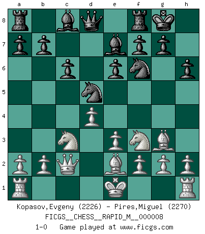 Last move : 1-0 2007 September 5 7:15:33 [Event "FICGS__CHESS__RAPID_M__000008"] [Site "FICGS"] [Date "2007.06.23"] [Round "1"] [White "Kopasov,Evgeny"] [Black "Pires,Miguel"] [Result "1-0"] [WhiteElo "2226"] [BlackElo "2270"] 1.d4 d5 2.c4 c6 3.Nf3 e6 4.Nc3 Nf6 5.Bg5 Be7 6.e3 h6 7.Bh4 O-O 8.Qc2 Nbd7 9.cxd5 Nxd5 10.Bg3 N7f6 11.Be2 1-0 This chess game has been lost on time (started : 2007.06.23 16:10:23) QGD Slav : 3.Nf3 Kingside Castling by player Black (move 7) Player White won this chess game. Follow this game move after move (download)Castle early and often. (Rob Sillars) Ivan Sokolov treibt mich als Beifahrer an mit go Loeky go - . (Loek van Wely) El Rey es una pieza de pelea. ¡Usenlo!. (Wilhelm Steinitz) Un journaliste : 'Vous préférez avoir une dame de plus sur l'échiquier ou au lit ?' Boris Spassky : 'Ca dépend de la position.' The modern world has divided itself into Conservatives and Progressives. The business of Progressives is to go on making mistakes. The business of the Conservatives is to prevent the mistakes from being corrected. (G.K. Chesterton)