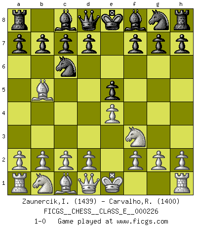 Last move : 1-0 2019 October 24 4:37:40 [Event "FICGS__CHESS__CLASS_E__000226"] [Site "FICGS"] [Date "2019.09.12"] [Round "1"] [White "Zaunercik,Ilmar"] [Black "Carvalho,Reinaldo"] [Result "1-0"] [WhiteElo "1439"] [BlackElo "1400"] 1.e4 e5 2.Nf3 Nc6 3.Bb5 1-0 This chess game has been lost on time (started : 2019.09.12 23:27:55) Ruy Lopez (Spanish Opening) Player White won this chess game. Follow this game move after move (download)Checkers is for tramps. (Paul Morphy) Der Freibauer hat für mich eine Seele, genau wie der Mensch, Wünsche, die unerkannt in ihm schlummern, und Befürchtungen, von deren Existenz er selbst kaum ahnt. (Aaron Nimzowitsch) Cuando estes solo, cuando te sientas un extraño en el mundo, juega al Ajedrez. Esto levantará tu espiritu y será tu consejero de guerra. (Aristóteles) Il (Jacob Murray) ne joue pas pour le bon coup, mais pour le meilleur. (Eloi Relange) I just play for fun. (Anna Kournikova)