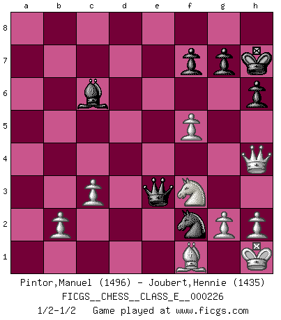 Last move : 1/2-1/2 2019 October 8 9:30:45 [Event "FICGS__CHESS__CLASS_E__000226"] [Site "FICGS"] [Date "2019.09.12"] [Round "1"] [White "Pintor,Manuel"] [Black "Joubert,Hennie"] [Result "1/2-1/2"] [WhiteElo "1496"] [BlackElo "1435"] 1.e4 c5 2.f4 Nc6 3.Nf3 e6 4.Bc4 d6 5.c3 Nf6 6.d3 Be7 7.O-O a6 8.a4 O-O 9.Ng5 h6 10.Nh3 Rb8 11.f5 d5 12.exd5 exd5 13.Bb3 b5 14.axb5 axb5 15.Qf3 Bb7 16.Qg3 Kh7 17.Nf4 Bd6 18.Qh3 c4 19.dxc4 dxc4 20.Bc2 Qc7 21.Kh1 Ne5 22.Nd2 Ra8 23.Rxa8 Rxa8 24.Nf3 Nd3 25.Nxd3 cxd3 26.Bxd3 Ra1 27.Bxb5 Bc6 28.Bd3 Bf4 29.Bxf4 Rxf1+ 30.Bxf1 Qxf4 31.Kg1 Qe3+ 32.Kh1 Ne4 33.Qh4 Nf2+ 34.Kg1 Nh3+ 35.Kh1 Nf2+ 36.Kg1 Nh3+ 37.Kh1 Nf2+ 1/2-1/2 Sicilian : Grand Prix attack Kingside Castling by player White (move 7) Kingside Castling by player Black (move 8) This chess game ended in a draw. Follow this game move after move (download)Chess, like love, is infectious at any age. (Flohr) Dieses schreckliche Gefühl, dass ich gegen eine Maschine spielte, die niemals Fehler macht, zerschmetterte meinen Widerstand. (Mark Taimanov) No hay otro maestro que tenga una voluntad terrífica de ganar. Al tablero, el irradía peligro y aún los oponentes mas fuertes tienden a congelarse como liebres cuando olfatean a una pantera. Aún sus debilidades son peligrosas. Con las blancas, su juego de apertura es predecible - te es posible hacer planes en su contra - pero es tan fuerte que tus planes casi nunca funcionan. En el juego medio, su precisión e invención son fabulosas y en finales, tú simplemente no le puedes vencer. (Experto Alemán anónimo) Je menace de comprendre la position. (Anonyme) Life is the sum of all your choices. (Albert Camus)