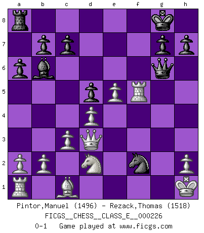 Last move : 0-1 2019 October 1 17:36:13 [Event "FICGS__CHESS__CLASS_E__000226"] [Site "FICGS"] [Date "2019.09.12"] [Round "1"] [White "Pintor,Manuel"] [Black "Rezack,Thomas"] [Result "0-1"] [WhiteElo "1496"] [BlackElo "1518"] 1.e4 e6 2.f4 Bc5 3.d4 Bb6 4.Nf3 d5 5.exd5 exd5 6.Be2 Nf6 7.O-O Nc6 8.Bb5 O-O 9.c3 Bf5 10.Ne5 Qd6 11.Kh1 a6 12.Bd3 Bxd3 13.Qxd3 Ne4 14.Nd2 f5 15.g4 Nxe5 16.fxe5 Qg6 17.gxf5 Rxf5 18.Rxf5 Nf2+ 0-1 French : Labourdonnais variation Kingside Castling by player White (move 7) Kingside Castling by player Black (move 8) Player Black won this chess game. Follow this game move after move (download)Live, lose, and learn, by observing your opponent how to win. (Amber Steenbock) Alle offensichtlichen Züge sehen nach dem Spiel in der Analyse verdächtig aus. (Viktor Kortschnoi) En posiciones complicadas, Bobby Fischer pocas veces tuvo que temer de cualquiera. (Paul Keres) A ce moment-là, je menaçais de comprendre la position ! (Clément L'Heureux) Be who you are, and say what you feel because those who mind don't matter, and those who matter don't mind. (Dr Seuss)