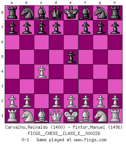 Last move : 0-1 2019 October 24 4:37:40 [Event "FICGS__CHESS__CLASS_E__000226"] [Site "FICGS"] [Date "2019.09.12"] [Round "1"] [White "Carvalho,Reinaldo"] [Black "Pintor,Manuel"] [Result "0-1"] [WhiteElo "1400"] [BlackElo "1496"] 1.c4 e5 0-1 This chess game has been lost on time (started : 2019.09.12 23:27:55) English Opening Player Black won this chess game. Follow this game move after move (download)I give 98 percent of my mental energy to Chess. Others give only 2 percent. (Bobby Fischer) Dein Körper muss in Topform sein. Dein Schach verfällt, wenn dein Körper verfällt. Der Körper kann nicht vom Geist getrennt werden. (Robert James Fischer) La partida mas dura de ganar es una partida ganada. (Emanuel Lasker) Plusieurs personnes se sont demandées comment Tal faisait pour gagner... En fait, c'est très simple ! Il met ses pièces au centre de l'échiquier et les sacrifie quelque part ! (David Bronstein) Memory is a complicated thing, a relative to truth, but not its twin. (Barbara Kingsolver, Animal Dreams)