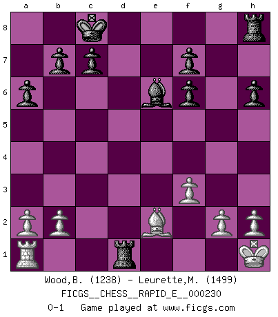 Last move : 0-1 2019 November 7 0:33:6 [Event "FICGS__CHESS__RAPID_E__000230"] [Site "FICGS"] [Date "2019.09.12"] [Round "1"] [White "Wood,Brian"] [Black "Leurette,Marc-Antoine"] [Result "0-1"] [WhiteElo "1238"] [BlackElo "1499"] 1.d4 d5 2.c4 e6 3.Nc3 Nf6 4.cxd5 exd5 5.Bg5 Be7 6.e3 Nc6 7.Bb5 Bd7 8.f3 a6 9.Bd3 h6 10.Bh4 Be6 11.Nge2 Qd7 12.O-O O-O-O 13.e4 dxe4 14.Nxe4 Nxd4 15.Nxf6 Bxf6 16.Bxf6 gxf6 17.Kh1 Nxe2 18.Bxe2 Qxd1 19.Rfxd1 Rxd1+ 0-1 This chess game has been lost on time (started : 2019.09.12 23:28:27) QGD : Exchange, positional line Kingside Castling by player White (move 12) Queenside Castling by player Black (move 12) Player Black won this chess game. Follow this game move after move (download)There's never before been a Chess player with such a thorough knowledge of the intricacies of the game and such an absolutely indomitable will to win. I think Bobby is the greatest player that ever lived. (Lisa Lane) Das ganze Leben mit einer Ehefrau ist wie ein Endspiel mit ungleichfarbigen Läufern. (Viktor Kortschnoi) El arma más poderosa en el Ajedrez, es tener la próxima movida. (David Bronstein) Mais l'homme est une créature légère et illogique : semblable au joueur d'échecs, il n'aime que le processus du but à atteindre, non le but lui-même. (Dostoïevsky) Fortune favours the audacious. (Desiderius Erasmus)