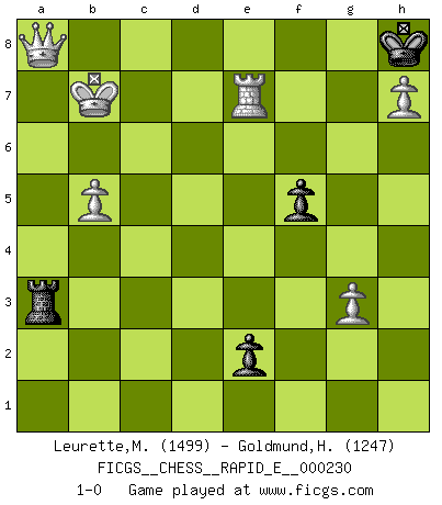 Last move : 1-0 2019 November 18 16:42:18 [Event "FICGS__CHESS__RAPID_E__000230"] [Site "FICGS"] [Date "2019.09.12"] [Round "1"] [White "Leurette,Marc-Antoine"] [Black "Goldmund,Heike"] [Result "1-0"] [WhiteElo "1499"] [BlackElo "1247"] 1.e4 d5 2.exd5 Qxd5 3.d4 e5 4.Nc3 Qxd4 5.Qd3 Qxd3 6.cxd3 Bd6 7.Nf3 Nc6 8.Be2 Nd4 9.Bd1 Nf6 10.Bg5 O-O 11.Bxf6 gxf6 12.Nd5 Bf5 13.Nxd4 Bxd3 14.Nb3 Be4 15.Bf3 Bxd5 16.Bxd5 c6 17.Be4 Rad8 18.O-O-O Kh8 19.Rd3 Bc7 20.Rh3 Rfe8 21.Bxh7 Kg7 22.Be4 Bb6 23.f3 Be3+ 24.Kb1 Kf8 25.Na5 Rd7 26.Nxb7 Rxb7 27.Bxc6 Reb8 28.Bxb7 Rxb7 29.Rh8+ Ke7 30.Rd1 Bd4 31.b3 Rc7 32.Rc1 Rb7 33.Rhc8 Kd7 34.h4 Be3 35.R1c2 Bd4 36.h5 Be3 37.Rh8 Rb4 38.h6 Rh4 39.h7 f5 40.R2c8 Bg5 41.Rcg8 Bf6 42.g3 Rh1+ 43.Kc2 Bxh8 44.Rxh8 Ke7 45.a4 f6 46.b4 Kf7 47.Ra8 Kg7 48.Rxa7+ Kh8 49.a5 e4 50.fxe4 fxe4 51.Re7 f5 52.a6 Rh2+ 53.Kc3 Ra2 54.b5 Ra3+ 55.Kc4 e3 56.Kc5 Rc3+ 57.Kb6 Rd3 58.a7 Ra3 59.Kb7 e2 60.a8Q+ 1-0 Scandinavian (centre counter) defense Kingside Castling by player Black (move 10) Queenside Castling by player White (move 18) 10 pieces endgame at move 50 : White KRPPPP , Black KRPP WHITE : King + 1 Rook 4 Pawns BLACK : King + 1 Rook 2 Pawns Promotion Queen by player White (move 60) Player White won this chess game. Follow this game move after move (download)Later, I began to succeed in decisive games. Perhaps because I realized a very simple truth: not only was I worried, but also my opponent. (Mikhail Tal) Im Spitzenschach von heute geht es nur um Vorbereitung, um tiefgründige, sorgfältige Eröffnungsvorbereitung. (Nigel Short) El Ajedrez es parte de una cultura y si una cultura esta en decadencia, entonces también el Ajedrez declinará. (Mikhail Botvinnik) La victoire dans une partie d'Echecs appartient la plupart du temps à celui qui voit un peu plus loin que l'adversaire. (Lasker) Now be brave and don't look back. Don't look back. (Shmi Skywalker in Star Wars ep.1)