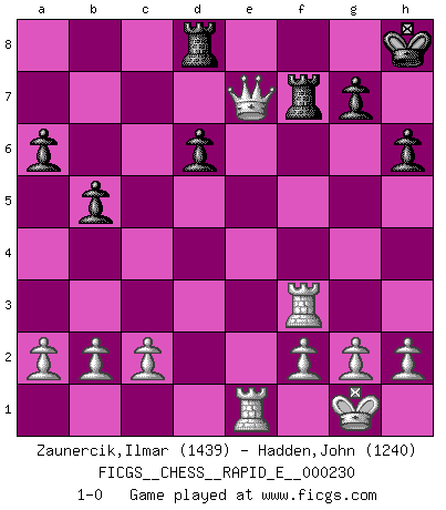 Last move : 1-0 2019 November 16 0:49:6 [Event "FICGS__CHESS__RAPID_E__000230"] [Site "FICGS"] [Date "2019.09.12"] [Round "1"] [White "Zaunercik,Ilmar"] [Black "Hadden,John"] [Result "1-0"] [WhiteElo "1439"] [BlackElo "1240"] 1.e4 e5 2.Nf3 Nc6 3.Bb5 a6 4.Ba4 d6 5.O-O b5 6.Bb3 Be6 7.d3 Nf6 8.Bxe6 fxe6 9.Bg5 h6 10.Bh4 Be7 11.Nc3 Qd7 12.d4 exd4 13.Nxd4 Nxd4 14.Qxd4 O-O 15.e5 Nd5 16.Bxe7 Qxe7 17.Nxd5 exd5 18.Qxd5+ Kh8 19.exd6 cxd6 20.Rad1 Rad8 21.Rfe1 Qf6 22.Qd4 Qg6 23.Rd3 Rf7 24.Qe4 Qf6 25.Rf3 Qe7 26.Qxe7 1-0 This chess game has been lost on time (started : 2019.09.12 23:28:27) Ruy Lopez : Modern Steinitz defense, 5.O-O Kingside Castling by player White (move 5) Kingside Castling by player Black (move 14) Player White won this chess game. Follow this game move after move (download)Chess teaches you to control the initial excitement you feel when you see something that looks good and it trains you to think objectively when you're in trouble. (Stanley Kubrick) Ein typischer, sehr verbreiteter Gedankenschädling ist der, daß der betreffende Amateur von der Annanhme ausgeht, daß jeder einzelne Zug etwas zu leisten habe. (Aaron Nimzowitsch) El ganador de una partida es aquel jugador que hace el penúltimo error. (Savielly Tartakover) L'action d'une oeuvre littéraire se déroule sur un champ de bataille. Les masques et les types du drame moderne correspondent aux pièces du jeu d'échecs. L'intrigue correspond aux coups et aux gambits, c'est à dire aux techniques du jeu telles qu'utilisées et interprétées par les joueurs. Les tactiques et les péripéties [mouvements] correspondent aux coups exécutés par l'adversaire. (Viktor Shklovsky) Imagination is more important than knowledge. Knowledge is limited. Imagination encircles the world. (Albert Einstein)