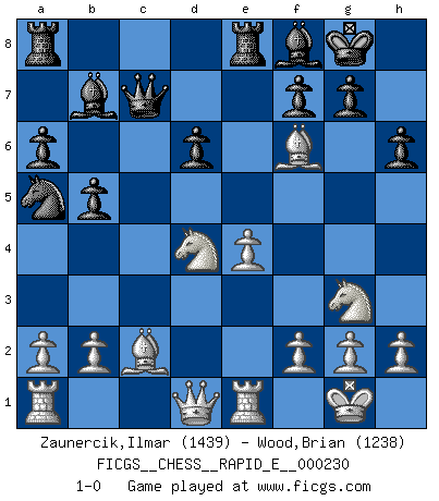 Last move : 1-0 2019 November 1 17:3:38 [Event "FICGS__CHESS__RAPID_E__000230"] [Site "FICGS"] [Date "2019.09.12"] [Round "1"] [White "Zaunercik,Ilmar"] [Black "Wood,Brian"] [Result "1-0"] [WhiteElo "1439"] [BlackElo "1238"] 1.e4 e5 2.Nf3 Nc6 3.Bb5 a6 4.Ba4 d6 5.O-O Nf6 6.d3 Be7 7.c3 b5 8.Bb3 O-O 9.Nbd2 Bb7 10.Re1 Na5 11.Bc2 c5 12.Nf1 Re8 13.Ng3 Qc7 14.d4 cxd4 15.cxd4 exd4 16.Nxd4 Bf8 17.Bg5 h6 18.Bxf6 1-0 Ruy Lopez : Modern Steinitz defense, 5.O-O Kingside Castling by player White (move 5) Kingside Castling by player Black (move 8) Player White won this chess game. Follow this game move after move (download)A strong memory, concentration, imagination, and a strong will is required to become a great Chess player. (Bobby Fischer) Frage: Was machen Sie mit den Preisen? Anwort: Ich habe Angst, dass meine Freundin davon neue Kleider kauft. (Loek van Wely) Bobby es el jugador de Ajedrez mas fino que este país jamás haya producido. Su memoria para las movidas, su brillantez en soñar combinaciones y su feróz determinación por la victoria son algo extraño. (John Collins) Les erreurs sont comme les malheurs, elles n'arrivent jamais seules. (Siegbert Tarrasch) When you don't know what to do, walk fast and look worried. (Anonymous)