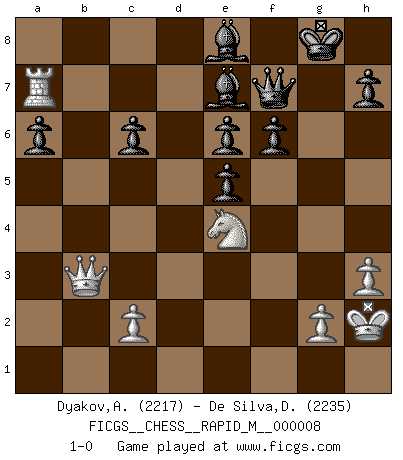Last move : 1-0 2007 October 14 18:53:20 [Event "FICGS__CHESS__RAPID_M__000008"] [Site "FICGS"] [Date "2007.06.23"] [Round "1"] [White "Dyakov,Alexander"] [Black "De Silva,Dinesh"] [Result "1-0"] [WhiteElo "2217"] [BlackElo "2235"] 1.e4 c5 2.Nf3 d6 3.d4 cxd4 4.Nxd4 Nf6 5.Nc3 a6 6.Bg5 e6 7.f4 Qb6 8.Qd2 Qxb2 9.Rb1 Qa3 10.f5 Nc6 11.fxe6 fxe6 12.Nxc6 bxc6 13.e5 dxe5 14.Bxf6 gxf6 15.Ne4 Qxa2 16.Rd1 Be7 17.Be2 O-O 18.O-O Ra7 19.Rf3 Kh8 20.Rg3 Rd7 21.Qh6 Rf7 22.Rxd7 Bxd7 23.h3 Qb1+ 24.Kh2 Qb8 25.Bh5 Qf8 26.Bxf7 Qxf7 27.Rb3 Be8 28.Rb7 Kg8 29.Qe3 Qf8 30.Qb3 Qf7 31.Ra7 1-0 Sicilian : Najdorf, 7...Qb6 Kingside Castling by player Black (move 17) Kingside Castling by player White (move 18) Player White won this chess game. Follow this game move after move (download)I don't believe in psychology. I believe in good moves. (Bobby Fischer) Ein Kibitz ist einer, der deinem Gegner gute Ratschläge gibt. (Andrew Soltis) Alekhine es un poeta que crea un trabajo de arte de algo que raramente inspiraría a otra persona a mandar una tarjeta postal. (Max Euwe) Le génie consiste à savoir transgresser les règles au moment opportun. (Teichmann) There is a very easy way to return from a casino with a small fortune : go there with a large one. (Jack Yelton)