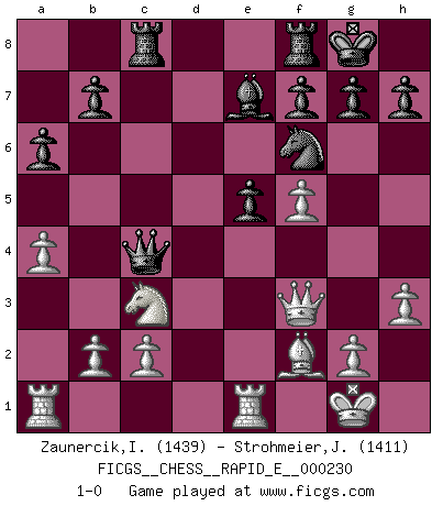 Last move : 1-0 2019 November 7 0:33:6 [Event "FICGS__CHESS__RAPID_E__000230"] [Site "FICGS"] [Date "2019.09.12"] [Round "1"] [White "Zaunercik,Ilmar"] [Black "Strohmeier,Josef"] [Result "1-0"] [WhiteElo "1439"] [BlackElo "1411"] 1.e4 c5 2.Nf3 Nc6 3.Bc4 e6 4.Nc3 a6 5.a4 Qc7 6.O-O Nf6 7.Re1 d6 8.d4 cxd4 9.Nxd4 Be7 10.Be3 O-O 11.Bb3 Bd7 12.h3 Rac8 13.f4 Na5 14.Qf3 Nc4 15.Bxc4 Qxc4 16.Bf2 e5 17.fxe5 dxe5 18.Nf5 Bxf5 19.exf5 1-0 This chess game has been lost on time (started : 2019.09.12 23:28:27) Sicilian defense Kingside Castling by player White (move 6) Kingside Castling by player Black (move 10) Player White won this chess game. Follow this game move after move (download)There just isn't enough televised Chess. (David Letterman) Kein Großmeister ist normal. Sie unterscheiden sich nur im Ausmaß Ihrer Verrücktheit. (Viktor Kortschnoi) Tu sabes que vas a perder. Aún cuando tenía la ventaja, yo sabía que iba a perder. - al estar jugando con Fischer (Andrew Soltis) Il n'y a pas eu de défaite parce que je ne crois pas que cet ordinateur ait jamais existé. IBM a triché en refusant d'imprimer les modes de recherche de la machine. C'est évident, pendant le match, des coups décisifs ont été joués par des êtres humains. Aujourd'hui, les meilleurs spécialistes en informatique ne peuvent toujours pas expliquer comment Deep-Blue a pu jouer contre la logique des ordinateurs. IBM a gagné une guerre de communication, mais ils sont incapables de prouver que l'ordinateur a gagné tout seul. (Garry Kasparov) Horse racing is animated roulette. (Roger Kahn)