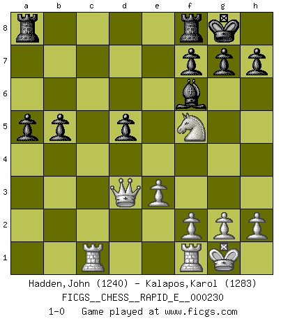 Last move : 1-0 2019 November 8 7:13:40 [Event "FICGS__CHESS__RAPID_E__000230"] [Site "FICGS"] [Date "2019.09.12"] [Round "1"] [White "Hadden,John"] [Black "Kalapos,Karol"] [Result "1-0"] [WhiteElo "1240"] [BlackElo "1283"] 1.d4 e6 2.Nc3 Nf6 3.Nf3 d5 4.Bg5 Be7 5.Bxf6 Bxf6 6.e3 O-O 7.Bd3 b6 8.a3 c6 9.O-O Qc7 10.b4 Ba6 11.Bxa6 Nxa6 12.Ne2 b5 13.c3 e5 14.dxe5 Bxe5 15.Qc2 Bf6 16.Ned4 c5 17.Nb3 cxb4 18.axb4 Nxb4 19.Qd1 Qxc3 20.Nbd4 a6 21.Qb3 Qc5 22.Rac1 Qd6 23.Nf5 Qe5 24.Nxe5 a5 25.Nd3 Nxd3 26.Qxd3 1-0 Queen's pawn Kingside Castling by player Black (move 6) Kingside Castling by player White (move 9) Player White won this chess game. Follow this game move after move (download)Fischer is an American Chess tragedy on par with Morphy and Pillsbury. (Mig Greengard) Im Hotelzimmer gab es nur zwei Schaben. (Über die Turnierbedingungen) (Peter Swidler) Cuando la partida de Ajedrez termina, el Peón y el Rey regresan a la misma caja. (Irish saying) Nous vivons dans un monde échiquéen : chaque jour qui passe est un défi à relever. (Philosophe Sasha) Art disturbs, science reassures. (Georges Braque, Le Jour et la Nuit)