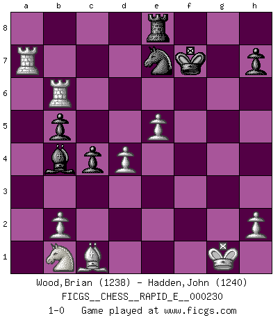 Last move : 1-0 2019 December 3 1:6:38 [Event "FICGS__CHESS__RAPID_E__000230"] [Site "FICGS"] [Date "2019.09.12"] [Round "1"] [White "Wood,Brian"] [Black "Hadden,John"] [Result "1-0"] [WhiteElo "1238"] [BlackElo "1240"] 1.d4 d5 2.c4 dxc4 3.Nf3 Bg4 4.e3 b5 5.a4 c6 6.axb5 cxb5 7.Be2 Nc6 8.O-O Bxf3 9.Bxf3 e6 10.Bxc6+ Ke7 11.Bxa8 Qxa8 12.Qf3 Qxf3 13.gxf3 f5 14.e4 fxe4 15.Rxa7+ Kf6 16.fxe4 Bb4 17.f4 Ne7 18.e5+ Kf7 19.f5 Re8 20.f6 gxf6 21.Rxf6+ Kg7 22.Rxe6 Kf7 23.Rb6 1-0 QGA : 3.Nf3 Kingside Castling by player White (move 8) Player White won this chess game. Follow this game move after move (download)Chess is the art of analysis. (Mikhail Botvinnik) Frage des Reporters: -Worin besteht das Ziel von Gambiteröffnungen? Antwort: -Auf Kosten der Partie einen Ruf als Angriffspieler zu erwerben.- (Siegbert Tarrasch) Al jugar al Ajedrez entonces, podemos aprender: Primero: Previsión... Segundo: Prudencia... Tercero: Cautela... Y al final, aprendemos del Ajedrez el hábito de no ser desanimados por apariencias malas presentes en el estado de nuestros asuntos, el hábito de la esperanza por una oportunidad favorable y la perseveración de los secretos de los recursos. (Benjamin Franklin) La guerre est enfant de la passion, la passion est enfant du narcissisme et le narcissisme est l'enfant. (...) Une autre partie ? (Thibault de Vassal) When a man with money meets a man with experience, the man with experience leaves with money and the man with money leaves with experience. (Anonymous)