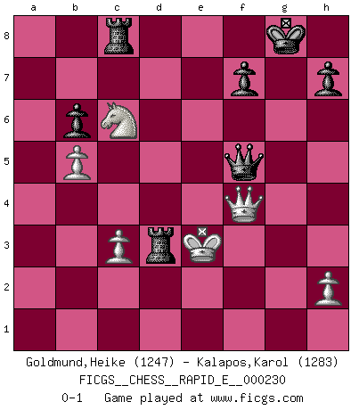 Last move : 0-1 2019 October 28 12:4:23 [Event "FICGS__CHESS__RAPID_E__000230"] [Site "FICGS"] [Date "2019.09.12"] [Round "1"] [White "Goldmund,Heike"] [Black "Kalapos,Karol"] [Result "0-1"] [WhiteElo "1247"] [BlackElo "1283"] 1.e4 e6 2.d4 d5 3.e5 c5 4.c3 Nc6 5.Bb5 Bd7 6.Nf3 Qb6 7.a4 a6 8.Bd3 cxd4 9.Nxd4 Nxe5 10.Be2 Nf6 11.O-O Be7 12.b4 O-O 13.Qb3 Ng6 14.Nd2 Rfc8 15.N2f3 Ne4 16.Bb2 Bf6 17.Bd3 Ne5 18.Bxe4 dxe4 19.Nxe5 Bxe5 20.Rfe1 Rc7 21.Rxe4 Bf6 22.Rc1 e5 23.Nf3 Bc6 24.Re3 e4 25.Nd4 Bg5 26.f4 exf3 27.Rxf3 Bxf3 28.gxf3 Be3+ 29.Kh1 Bxc1 30.Bxc1 Qf6 31.Bd2 Rac8 32.b5 axb5 33.axb5 b6 34.Nc6 Qxf3+ 35.Kg1 Qd3 36.Bf4 Rd7 37.Kf2 Qf5 38.Qc4 g5 39.Ke3 gxf4+ 40.Qxf4 Rd3+ 0-1 French : Advance variation Kingside Castling by player White (move 11) Kingside Castling by player Black (move 12) Player Black won this chess game. Follow this game move after move (download)It's just you and your opponent at the board and you're trying to prove something. (Bobby Fischer) Ich glaube nicht an Psychologie, ich glaube an gute Züge. (Robert James Fischer) A través de las casillas del tablero, los Indios explican el movimiento del tiempo y la edad, las influencias mas altas que controlan el mundo y los lazos que vinculan al Ajedrez con el alma humana. (Al-Masudi) L'ordinateur a tué l'originalité. Il n'y a plus guère d'aventures sur l'échiquier. (Jacob Murray) Opportunities multiply as they are seized. (Sun Tzu)