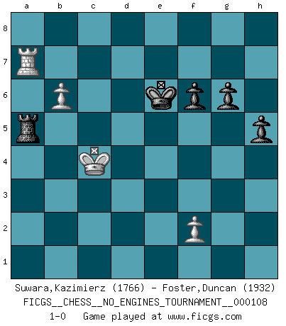 Last move : 1-0 2020 May 25 14:52:46 [Event "FICGS__CHESS__NO_ENGINES_TOURNAMENT__000108"] [Site "FICGS"] [Date "2019.09.13"] [Round "1"] [White "Suwara,Kazimierz"] [Black "Foster,Duncan"] [Result "1-0"] [WhiteElo "1766"] [BlackElo "1932"] 1.e4 c6 2.d4 d5 3.Nc3 dxe4 4.Nxe4 Bf5 5.Ng3 Bg6 6.h4 h6 7.Nf3 Nd7 8.h5 Bh7 9.Be3 Ngf6 10.Bd3 Bxd3 11.Qxd3 e6 12.O-O-O Qc7 13.Kb1 Bd6 14.Ne4 Nxe4 15.Qxe4 O-O-O 16.c3 Nf6 17.Qd3 Qa5 18.c4 Rhe8 19.Qc2 Qf5 20.Qxf5 exf5 21.Ne5 Bxe5 22.dxe5 Rxd1+ 23.Rxd1 Rxe5 24.Bd4 Re6 25.Bxa7 Nxh5 26.Bb6 Re8 27.Kc2 Nf4 28.g3 Ne6 29.a4 Nc7 30.a5 Re4 31.Kd3 h5 32.b4 Rg4 33.Rh1 g6 34.Be3 Ne6 35.b5 cxb5 36.cxb5 Ra4 37.Rc1+ Kd7 38.Bd2 f4 39.gxf4 Nxf4+ 40.Bxf4 Rxf4 41.b6 Ra4 42.Rc7+ Ke6 43.Rxb7 Rxa5 44.Kc4 f6 45.Ra7 1-0 Caro-Kann : Classical, 7...Nd7 Queenside Castling by player White (move 12) Queenside Castling by player Black (move 15) 10 pieces endgame at move 43 : White KRPPP , Black KRPPP WHITE : King + 1 Rook 3 Pawns BLACK : King + 1 Rook 3 Pawns 9 pieces endgame at move 43 : White KRPP , Black KRPPP WHITE : King + 1 Rook 2 Pawns BLACK : King + 1 Rook 3 Pawns Player White won this chess game. Follow this game move after move (download)The chessboard is the world, the pieces are the phenomena of the Universe, the rules of the game are what we call the laws of Nature and the player on the other side is hidden from us. (Thomas Huxley) Der Umstand, daß uns eine 7 Stunden Zeitkontrolle ermöglicht eine großartige, tiefe Partie zu spielen, ist für die Massenmedien nicht weiter von Bedeutung. (Alexej Shirov) Los errores estan ahí, esperando a que se cometan. (Savielly Tartakower) Le joueur d'Echecs qui veut atteindre le top est obligé de développer son propre credo créatif. Alexeï Stepanovicth Souétine. Il est facile d'écrire des livres ! Ce qui est difficile, c'est de jouer ! (Alexeï Stepanovicth Souétine) Experiences are the keys to life. (Daniel Parmet)