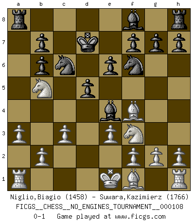 Last move : 0-1 2019 November 1 22:54:25 [Event "FICGS__CHESS__NO_ENGINES_TOURNAMENT__000108"] [Site "FICGS"] [Date "2019.09.13"] [Round "1"] [White "Niglio,Biagio"] [Black "Suwara,Kazimierz"] [Result "0-1"] [WhiteElo "1458"] [BlackElo "1766"] 1.d4 Nf6 2.Nf3 d5 3.Bf4 c5 4.c3 Nc6 5.e3 Qb6 6.Qc2 Bf5 7.dxc5 Bxc2 8.cxb6 axb6 9.Na3 Be4 10.Nb5 Kd7 11.a3 e6 0-1 Queen's pawn game Player Black won this chess game. Follow this game move after move (download)Of all my Russian books, the defense contains and diffuses the greatest 'warmth' which may seem odd seeing how supremely abstract Chess is supposed to be. (Vladimir Nabokov) Die westlichen Werte sind eine Sprache, welche die Putin-Administration nicht versteht. (Garry Kasparov) Sin errores no puede haber brillantez. (Emanuel Lasker) Les erreurs sont comme les malheurs, elles n'arrivent jamais seules. (Siegbert Tarrasch) The bottom line is always the bottom line. (Johann Piek)