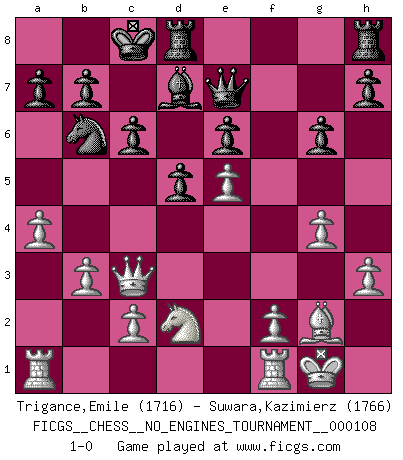 Last move : 1-0 2019 December 10 15:55:38 [Event "FICGS__CHESS__NO_ENGINES_TOURNAMENT__000108"] [Site "FICGS"] [Date "2019.09.13"] [Round "1"] [White "Trigance,Emile"] [Black "Suwara,Kazimierz"] [Result "1-0"] [WhiteElo "1716"] [BlackElo "1766"] 1.a3 g6 2.e4 Bg7 3.d4 c6 4.Nf3 d5 5.e5 Nh6 6.h3 f6 7.Bf4 e6 8.g4 Nf7 9.exf6 Qxf6 10.Qd2 Nd7 11.Bg2 Nb6 12.Ne5 Qe7 13.O-O Nxe5 14.Bxe5 Bxe5 15.dxe5 Nc4 16.Qc3 Bd7 17.b3 Nb6 18.Nd2 O-O-O 19.a4 1-0 This chess game has been lost on time (started : 2019.09.13 0:3:1) Anderssen's Opening Kingside Castling by player White (move 13) Queenside Castling by player Black (move 18) Player White won this chess game. Follow this game move after move (download)For me, Chess is life and every game is like a new life. Every Chess player gets to live many lives in one lifetime. (Eduard Gufeld) Das Blackmar-Diemer-Gambit verändert den ganzen Menschen! (Emil Joseph Diemer) El Ajedrez es un juego terrible. Si no dominas el centro, tu oponente tiene una posición mas libre. Si tu tienes el centro, entonces realmente tienes algo de que preocuparte. (Siegbert Tarrasch) Il n'y a pas eu de défaite parce que je ne crois pas que cet ordinateur ait jamais existé. IBM a triché en refusant d'imprimer les modes de recherche de la machine. C'est évident, pendant le match, des coups décisifs ont été joués par des êtres humains. Aujourd'hui, les meilleurs spécialistes en informatique ne peuvent toujours pas expliquer comment Deep-Blue a pu jouer contre la logique des ordinateurs. IBM a gagné une guerre de communication, mais ils sont incapables de prouver que l'ordinateur a gagné tout seul. (Garry Kasparov) Life is painting a picture, not doing a sum. (Oliver Wendell Holmes, Jr.)