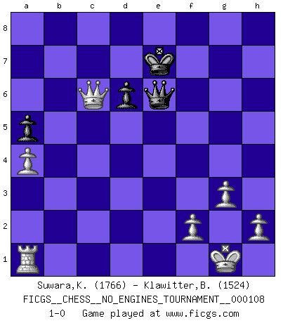 Last move : 1-0 2020 April 13 20:36:21 [Event "FICGS__CHESS__NO_ENGINES_TOURNAMENT__000108"] [Site "FICGS"] [Date "2019.09.13"] [Round "1"] [White "Suwara,Kazimierz"] [Black "Klawitter,Bernd"] [Result "1-0"] [WhiteElo "1766"] [BlackElo "1524"] 1.e4 c5 2.Nf3 Nc6 3.d4 cxd4 4.Nxd4 Nf6 5.Nc3 e5 6.Ndb5 d6 7.Bg5 a6 8.Na3 b5 9.Bxf6 gxf6 10.Nd5 Bg7 11.g3 Be6 12.Bg2 O-O 13.O-O Ra7 14.Re1 Rd7 15.b3 Re8 16.c4 Bxd5 17.exd5 Na7 18.Nc2 bxc4 19.bxc4 a5 20.a4 f5 21.Bh3 Rc7 22.Bxf5 Rxc4 23.Qd3 Rc7 24.Bxh7+ Kf8 25.Be4 Nc8 26.Reb1 f5 27.Bxf5 e4 28.Bxe4 Bxa1 29.Rxa1 Qf6 30.Nd4 Ne7 31.Qd1 Nc6 32.Ne6+ Rxe6 33.dxe6 Qxe6 34.Bxc6 Rxc6 35.Qf3+ Ke7 36.Qxc6 1-0 Sicilian : Pelikan (Lasker/Sveshnikov) variation Kingside Castling by player Black (move 12) Kingside Castling by player White (move 13) Player White won this chess game. Follow this game move after move (download)It is peculiar but a fact nevertheless, that gamblers in chess always have enthusiastic followers. (Botvinnik) Die FIDE ist dabei in die Hände der russischen Mafia zu fallen. (Larry Evans) No es tiempo de jugar al Ajedrez cuando la casa esta en llamas. (Proverbio Italiano) Les ravages du H expliquent la différence de niveau entre Tal et Thal [Abergel]. A woman without a man is like a fish without a bicycle. (Gloria Steinem)