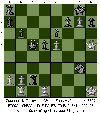 Last move : 0-1 2019 November 25 21:32:27 [Event "FICGS__CHESS__NO_ENGINES_TOURNAMENT__000108"] [Site "FICGS"] [Date "2019.09.13"] [Round "1"] [White "Zaunercik,Ilmar"] [Black "Foster,Duncan"] [Result "0-1"] [WhiteElo "1439"] [BlackElo "1932"] 1.e4 c6 2.d4 d5 3.exd5 cxd5 4.Nf3 Bg4 5.h3 Bh5 6.Nbd2 Nc6 7.Bb5 Nf6 8.g4 Bg6 9.Ne5 Qb6 10.Qe2 Bxc2 11.Ndf3 Be4 12.O-O Bxf3 13.Qxf3 Qxb5 14.g5 Nxe5 15.dxe5 Ne4 16.Rd1 e6 17.Be3 Be7 18.h4 b6 19.Rab1 O-O 20.Kg2 Rfc8 21.h5 Bxg5 22.h6 Bxe3 23.Qxe3 Rc2 24.hxg7 Rxf2+ 25.Kg1 Re2 26.Qf3 Qc5+ 27.Kh1 Nf2+ 28.Kg2 Rc2 29.Qh5 Ne4 30.Kh1 Ng3+ 0-1 Caro-Kann : Exchange variation Kingside Castling by player White (move 12) Kingside Castling by player Black (move 19) Player Black won this chess game. Follow this game move after move (download)Good offense and good defense both begin with good development. (Bruce A. Moon) Besser ein falscher Plan, logisch durchgeführt, als gar kein Plan. (Viktor Kortschnoi) Aquel que teme a un Peón de Reina aislado, debería de retirarse del Ajedrez. (Siegbert Tarrasch) Avant la finale, les dieux ont créé le milieu de partie. (Tarrasch) In my experience, there's no such thing as luck. (Obi-Wan Kenobi in Star Wars ep.4)