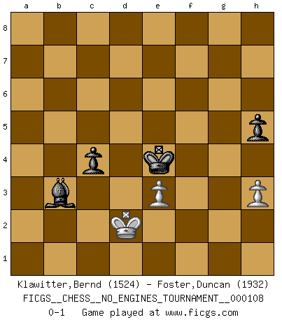Last move : 0-1 2020 January 29 22:51:55 [Event "FICGS__CHESS__NO_ENGINES_TOURNAMENT__000108"] [Site "FICGS"] [Date "2019.09.13"] [Round "1"] [White "Klawitter,Bernd"] [Black "Foster,Duncan"] [Result "0-1"] [WhiteElo "1524"] [BlackElo "1932"] 1.d4 f5 2.g3 Nf6 3.Bg2 d6 4.c3 e6 5.Be3 Be7 6.Nh3 Nc6 7.O-O O-O 8.Kh1 Ng4 9.Qd2 Nxe3 10.fxe3 e5 11.Bxc6 bxc6 12.dxe5 dxe5 13.Qxd8 Rxd8 14.Na3 Ba6 15.Ng1 g6 16.Rad1 Rab8 17.Rxd8+ Rxd8 18.Nb1 Bc5 19.Kg2 e4 20.Kf2 Kf7 21.b4 Be7 22.a4 Bc4 23.Rc1 Kf6 24.Ke1 a5 25.Nd2 Bf7 26.Nh3 axb4 27.cxb4 Bxb4 28.Rxc6+ Ke5 29.Rc2 c5 30.Nf2 Be8 31.Ra2 c4 32.Nd1 Rxd2 33.Rxd2 Bxd2+ 34.Kxd2 Bxa4 35.Nc3 Bc6 36.Nd1 g5 37.Nf2 Ba4 38.Kc3 Bb3 39.h3 h5 40.Kd2 f4 41.gxf4+ gxf4 42.exf4+ Kxf4 43.e3+ Kf3 44.Nxe4 Kxe4 0-1 Dutch defense Kingside Castling by player White (move 7) Kingside Castling by player Black (move 7) 10 pieces endgame at move 42 : White KNPPP , Black KBPPP WHITE : King + 1 Knight 3 Pawns BLACK : King + 1 Bishop 3 Pawns 9 pieces endgame at move 42 : White KNPP , Black KBPPP WHITE : King + 1 Knight 2 Pawns BLACK : King + 1 Bishop 3 Pawns 8 pieces endgame at move 44 : White KNPP , Black KBPP WHITE : King + 1 Knight 2 Pawns BLACK : King + 1 Bishop 2 Pawns 7 pieces endgame at move 44 : White KPP , Black KBPP WHITE : King + 2 Pawns BLACK : King + 1 Bishop 2 Pawns Player Black won this chess game. Follow this game move after move (download)Chess problems demand from the composer the same virtues that characterize all worthwhile art: originality, invention, conciseness, harmony, complexity, and splendid insincerity. (Vladimir Nabokov) Fallen sollten polizeilich verboten werden. (Savielly Grigorievitsch Tartakower) Los finales de Peón son del Ajedrez lo que el cesped es del Golf. (Cecil Purdy) Ne tendez aucun piège pour le plaisir ! Ne jouez rien dans l'espoir que l'adversaire réagisse de façon stupide ! Prenez toujours pour acquis que l'adversaire va trouver le meilleur coup ! Ne jouez jamais de coup dans l'espoir que l'adversaire ne voie pas la menace ! Chacun de vos coups doit améliorer la position d'une façon ou d'une autre. We cannot be sure of having something to live for unless we are willing to die for it. (Ernesto Che Guevara)