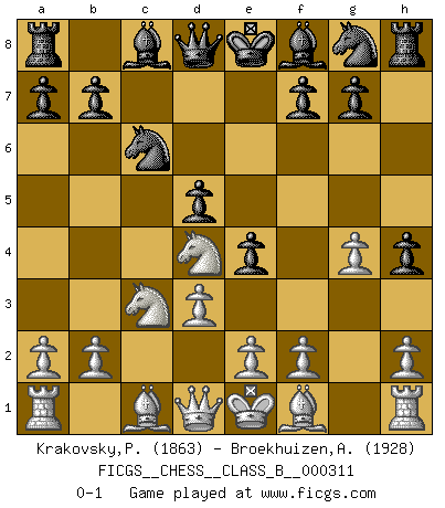Last move : 0-1 2019 December 23 12:17:31 [Event "FICGS__CHESS__CLASS_B__000311"] [Site "FICGS"] [Date "2019.09.15"] [Round "1"] [White "Krakovsky,Peter"] [Black "Broekhuizen,A. T. S."] [Result "0-1"] [WhiteElo "1863"] [BlackElo "1928"] 1.c4 e5 2.g3 h5 3.Nc3 h4 4.g4 c6 5.Nf3 d5 6.cxd5 e4 7.Nd4 cxd5 8.d3 Nc6 0-1 This chess game has been lost on time (started : 2019.09.15 13:52:30) English Opening Player Black won this chess game. Follow this game move after move (download)When you absolutely don't know what to do anymore, it is time to panic. (John van der Wiel) Versuche, dich von der Sklaverei der Eröffnungsvarianten zu befreien. Stattdessen soll man gewisse Typenpositionen erlernen, die man eingehend analysiert. (Aaron Nimzowitsch) El Ajedrez es como la guerra en un tablero. (Bobby Fischer) Des combinaisons [dans le jeu d'échecs] pareilles à des mélodies. Je crois entendre pour ainsi dire la musique des coups... (Vladimir Nabokov) Gambling is the son of avarice and the father of despair. (French proverb)