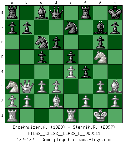 Last move : 1/2-1/2 2020 January 22 14:36:0 [Event "FICGS__CHESS__CLASS_B__000311"] [Site "FICGS"] [Date "2019.09.15"] [Round "1"] [White "Broekhuizen,A. T. S."] [Black "Sternik,Ryszard"] [Result "1/2-1/2"] [WhiteElo "1928"] [BlackElo "2097"] 1.e4 c5 2.d3 e6 3.g3 Nc6 4.Bg2 g6 5.Nf3 Bg7 6.O-O Nge7 7.c3 O-O 8.Na3 e5 9.Re1 d6 10.Be3 f5 11.Qb3+ Kh8 12.Ng5 f4 13.Bd2 Qe8 14.Nc4 Qd8 15.Na3 Qd7 16.Bh3 Qd8 1/2-1/2 Sicilian defense Kingside Castling by player White (move 6) Kingside Castling by player Black (move 7) This chess game ended in a draw. Follow this game move after move (download)You are for me the Queen on d8 and I am the Pawn on d7 !! (Eduard Gufeld) Schach ist die gewalttätigste aller Sportarten. (Garry Kasparov) Dejen al perfeccionista jugar por correo. (Yasser Seirawan) Shah mat. Le roi est mort. Cri de fierté d'un joueur venant de terrasser son adversaire, courtoisement, sans effusion de sang. No, no, you're not thinking; you're just being logical. (Niels Bohr)