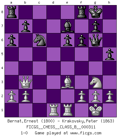 Last move : 1-0 2020 January 19 19:20:47 [Event "FICGS__CHESS__CLASS_B__000311"] [Site "FICGS"] [Date "2019.09.15"] [Round "1"] [White "Bernat,Ernest"] [Black "Krakovsky,Peter"] [Result "1-0"] [WhiteElo "1800"] [BlackElo "1863"] 1.e4 c5 2.c3 Nf6 3.e5 Nd5 4.d4 cxd4 5.Nf3 Nc6 6.cxd4 d6 7.Bc4 dxe5 8.dxe5 Ndb4 9.Qb3 e6 10.O-O Na5 11.Bb5+ Bd7 12.Qa4 Bxb5 13.Qxb5+ Nac6 14.Nc3 a6 15.Qc4 Qd3 16.Qg4 h5 17.Qh4 Qf5 18.Bg5 Nd3 19.Rad1 Ncxe5 20.Nxe5 Nxe5 21.Qa4+ Nc6 22.Ne4 f6 23.Be3 Be7 24.Rfe1 O-O 25.Ng3 Qg6 26.Qb3 1-0 Sicilian : Alapin's variation (2.c3) Kingside Castling by player White (move 10) Kingside Castling by player Black (move 24) Player White won this chess game. Follow this game move after move (download)All Chess players should have a hobby. (Savielly Tartakower) Schach ist Leben. (Robert James Fischer) El Ajedrez no es como la vida... ¡tiene reglas!. (Mark Pasternak) Mais n'est-ce pas déjà le limiter injurieusement que d'appeler les échecs un jeu? N'est-ce pas aussi une science, un art, ou quelque chose qui, comme le cercueil de Mahomet entre ciel et terre, est suspendu entre l'un et l'autre, et qui réunit un nombre incroyable de contraires ? (Stefan Zweig) A computer lets you make more mistakes faster than any invention in human history - with the possible exceptions of handguns and tequila. (Mitch Ratcliffe)