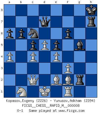 Last move : 0-1 2007 November 23 10:42:31 [Event "FICGS__CHESS__RAPID_M__000008"] [Site "FICGS"] [Date "2007.06.23"] [Round "1"] [White "Kopasov,Evgeny"] [Black "Yunusov,Adkham"] [Result "0-1"] [WhiteElo "2226"] [BlackElo "2394"] 1.d4 Nf6 2.c4 g6 3.Nc3 Bg7 4.e4 d6 5.Nf3 O-O 6.Be2 e5 7.Be3 c6 8.d5 Na6 9.O-O Ng4 10.Bg5 f6 11.Bh4 c5 12.Ne1 h5 13.a3 Nh6 14.h3 Nf7 15.Nd3 Bd7 16.b4 b6 17.Rb1 Qe7 18.Qc2 Bh6 19.bxc5 Nxc5 20.Nxc5 dxc5 21.a4 Nd6 22.Rb3 g5 23.Bg3 g4 24.hxg4 hxg4 25.Nb5 Nb7 26.Qd1 Qg7 27.Ra3 Qg6 28.Qc2 Rf7 29.f3 gxf3 30.Raxf3 Rg7 31.Bd3 Bg5 32.Qf2 Qh6 33.Nc7 Rh7 34.Qe2 Rc8 35.Nb5 Bg4 36.Kf2 a6 37.Na3 Kh8 38.Ke1 Na5 39.Qc2 Bc1 40.Nb1 Rg8 41.Bf2 Bxf3 42.gxf3 Rg2 43.Kd1 Bg5 44.Qc3 Qh3 45.Be2 Qd7 46.Qc2 Nc6 0-1 King's Indian : Gligoric-Taimanov system Kingside Castling by player Black (move 5) Kingside Castling by player White (move 9) Player Black won this chess game. Follow this game move after move (download)No Chess Grandmaster is normal; they only differ in the extent of their madness. (Viktor Korchnoi) Mein erstes Ziel war nicht, die Partie zu gewinnen, sondern eine Figur zu opfern. -- der junge (Wilhelm Steinitz) Fischer era un maestro de claridad y un Rey del posicionamiento astuto. Sus oponentes podían ver hacia donde se dirigía pero eran impotentes para detenerlo. (Bruce Pandolfini) La vérité est comme le meilleur coup aux échecs : elle existe, mais il faut la chercher. (Arturo Perez-Reverte) The right perception of any matter and a misunderstanding of the same matter do not wholly exclude each other. (Kafka's the trial)