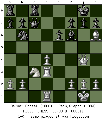 Last move : 1-0 2019 December 19 12:41:16 [Event "FICGS__CHESS__CLASS_B__000311"] [Site "FICGS"] [Date "2019.09.15"] [Round "1"] [White "Bernat,Ernest"] [Black "Pech,Stepan"] [Result "1-0"] [WhiteElo "1800"] [BlackElo "1893"] 1.e4 c5 2.c3 Nf6 3.e5 Nd5 4.Nf3 Nc6 5.d4 cxd4 6.cxd4 d6 7.Bc4 Nb6 8.Bb5 dxe5 9.Nxe5 Bd7 10.Nxd7 Qxd7 11.O-O e6 12.Nc3 Be7 13.Qg4 O-O 14.Bxc6 Qxc6 15.Bh6 Bf6 16.Rfd1 Qc7 17.Rd3 Rfc8 18.Rad1 1-0 This chess game has been lost on time (started : 2019.09.15 13:52:30) Sicilian : Alapin's variation (2.c3) Kingside Castling by player White (move 11) Kingside Castling by player Black (move 13) Player White won this chess game. Follow this game move after move (download)In complicated positions, Bobby Fischer hardly had to be afraid of anybody. (Paul Keres) Je mehr ich von der FIDE weiss, um so weniger verstehe ich. (Alexander Kalifman) Para mi, el Ajedrez es la vida y cada partida es como una nueva vida. Todo jugador de Ajedrez suele vivir muchas vidas durante su vida. (Eduard Gufeld) Les écrivains ont utilisé les échecs pour analyser les côtés extrêmes de la nature humaine. Dans ce cadre, les échecs offrent un champ d'expérimentation idéal. Mais on pourrait faire la même chose avec la peinture. Et là, en vous référant à Van Gogh, vous ne tirerez pas de conclusion définitive sur les peintres. (Gary Kasparov) Life is like a play: it's not the length but the excellence of the acting that matters. (Seneca)