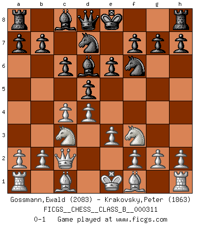 Last move : 0-1 2019 November 7 14:36:23 [Event "FICGS__CHESS__CLASS_B__000311"] [Site "FICGS"] [Date "2019.09.15"] [Round "1"] [White "Gossmann,Ewald"] [Black "Krakovsky,Peter"] [Result "0-1"] [WhiteElo "2083"] [BlackElo "1863"] 1.d4 Nf6 2.c4 d5 3.Nf3 c6 4.Nc3 e6 5.e3 Nbd7 6.Qc2 Bd6 0-1 This chess game has been lost on time (started : 2019.09.15 13:52:30) Queen's pawn game Player Black won this chess game. Follow this game move after move (download)Chess is the gymnasium of the mind. (Blaise Pascal) Obwohl ich vom Stil her kaum zu den Priestern der Schachkunst gezählt werde, halte ich Schach doch für eine Kunst. (Tigran Petrosjan) Una de estas pequeñas movidas modestas pudieran ser mas molestas a tu oponente que la amenaza mas grande. (Siegbert Tarrasch) L'ordinateur a tué l'originalité. Il n'y a plus guère d'aventures sur l'échiquier. (Jacob Murray) If everyone is thinking alike, then somebody isn't thinking. (US General George S. Patton)