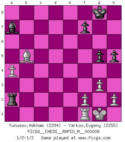 Last move : 1/2-1/2 2007 November 7 3:47:34 [Event "FICGS__CHESS__RAPID_M__000008"] [Site "FICGS"] [Date "2007.06.23"] [Round "1"] [White "Yunusov,Adkham"] [Black "Yarkov,Evgeny"] [Result "1/2-1/2"] [WhiteElo "2394"] [BlackElo "2255"] 1.e4 c5 2.c3 d5 3.exd5 Qxd5 4.d4 Nf6 5.Nf3 e6 6.Be2 cxd4 7.cxd4 Nc6 8.O-O Be7 9.Nc3 Qd6 10.Nb5 Qd8 11.Bf4 Nd5 12.Bg3 a6 13.Nc3 O-O 14.Rc1 Nf6 15.a3 b6 16.Bc4 Bb7 17.Ba2 Rc8 18.d5 exd5 19.Nxd5 Nxd5 20.Bxd5 Bf6 21.Ne5 Nxe5 22.Bxb7 Rxc1 23.Qxc1 Nd3 24.Qc6 Nc5 25.Bd6 Re8 26.Bxc5 bxc5 27.Qxc5 Bxb2 28.Bxa6 Qa8 29.Qb4 Rb8 30.Qa4 Be5 31.Rd1 g6 32.Qa5 Bd4 33.Qc7 Qa7 34.Qxa7 Bxa7 35.a4 Rb2 36.Rf1 h5 37.g3 Ra2 38.Bb5 g5 1/2-1/2 Sicilian : Alapin's variation (2.c3) Kingside Castling by player White (move 8) Kingside Castling by player Black (move 13) This chess game ended in a draw. Follow this game move after move (download)When I asked Fischer why he had not played a certain move in our game, he replied: 'Well, you laughed when I wrote it down !' (Mikhail Tal) Ich spiele ehrlich und spiele, um zu gewinnen. Wenn ich verliere nehme ich meine Medizin. (Robert James Fischer) Con o sin el título, Bobby Fischer fue sin lugar a dudas el mas grande jugador de su época. (Burt Hochberg) A chaque perte on perd un peu de soi. (Joël Lautier) A computer lets you make more mistakes faster than any invention in human history - with the possible exceptions of handguns and tequila. (Mitch Ratcliffe)