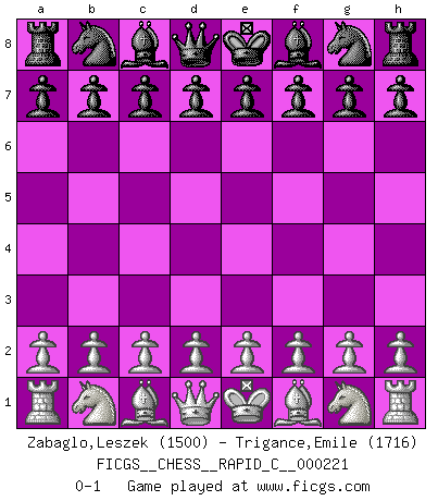 Last move : 0-1 2019 October 18 13:3:8 [Event "FICGS__CHESS__RAPID_C__000221"] [Site "FICGS"] [Date "2019.09.18"] [Round "1"] [White "Zabaglo,Leszek"] [Black "Trigance,Emile"] [Result "0-1"] [WhiteElo "1500"] [BlackElo "1716"] 0-1 This chess game has been lost on time (started : 2019.09.18 9:36:4) Player Black won this chess game. Follow this game move after move (download)We cannot resist the fascination of sacrifice, since a passion for sacrifices is part of a Chessplayer's nature. (Rudolf Spielman) Schach ist das schnellste Spiel der Welt, weil man in jeder Sekunde Tausende von Gedanken ordnen muß. (Albert Einstein) El Ajedrez es tortura mental. (Garry Kasparov) Le pion, dans sa simplicité, marche droit devant lui, mais lorsqu'il prend, il le fait obliquement? Ainsi l'homme, tant qu'il reste pauvre, marche dans la droiture et vit honnêtement, mais lorsqu'il recherche les honneurs, il flatte, se parjure et, par les voies obliques, cherche une position supérieure sur l'échiquier du monde. (Jean de Galles) Information on the Internet is subject to the same rules and regulations as conversation at a bar. (George Lundberg)