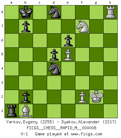 Last move : 0-1 2008 January 1 7:36:13 [Event "FICGS__CHESS__RAPID_M__000008"] [Site "FICGS"] [Date "2007.06.23"] [Round "1"] [White "Yarkov,Evgeny"] [Black "Dyakov,Alexander"] [Result "0-1"] [WhiteElo "2255"] [BlackElo "2217"] 1.e4 c6 2.d4 d5 3.e5 Bf5 4.Nf3 e6 5.Be2 Nd7 6.O-O Bg6 7.Nbd2 Ne7 8.Nh4 c5 9.c3 cxd4 10.cxd4 Nf5 11.Nxg6 hxg6 12.Nf3 Be7 13.Bd3 Nb8 14.Bd2 Nc6 15.Bc3 a6 16.b3 Qb6 17.Rc1 Ba3 18.Rc2 a5 19.h3 O-O 20.Qa1 Rfc8 21.g4 Nfe7 22.Bb2 Bxb2 23.Qxb2 Nb4 24.Rxc8+ Rxc8 25.Bb1 Qc7 26.Re1 Qc3 27.Qe2 Nec6 28.a3 Na6 29.Qe3 Qb2 30.h4 Qxa3 31.Kg2 Kf8 32.h5 gxh5 33.gxh5 Nd8 34.Rh1 Nc7 35.Bc2 Nb5 36.Bd3 Na7 37.h6 gxh6 38.Qxh6+ Ke8 39.Ng5 Qe7 40.b4 Rc3 41.Be2 axb4 42.Nh7 Kd7 43.Nf6+ Kc8 44.Qd2 Nac6 45.Rh8 Kb8 46.Ne8 Ra3 47.Bd1 b3 48.Qc3 Qb4 49.Qxb4 Nxb4 50.Nd6 Nbc6 51.Nxf7 b2 52.Bc2 Nxd4 53.Bb1 Ra1 0-1 Caro-Kann : Advance variation Kingside Castling by player White (move 6) Kingside Castling by player Black (move 19) Player Black won this chess game. Follow this game move after move (download)I give 98 percent of my mental energy to Chess. Others give only 2 percent. (Bobby Fischer) Alles was am Schachbrett zählt sind gute Züge. (Robert James Fischer) Botvinnik trató de alejar el misterio referente al Ajedrez, siempre relacionandolo a situaciones de la vida diaria. Solía llamar al Ajedrez un problema inexacto típico, similar a aquellos en que la gente tiene siempre que resolver a cada día. (Garry Kasparov) Soyez une menace à chaque fois que vous vous asseyez pour jouer. (Ken Smith) Winning isn't everything... but losing is nothing. (Mednis)