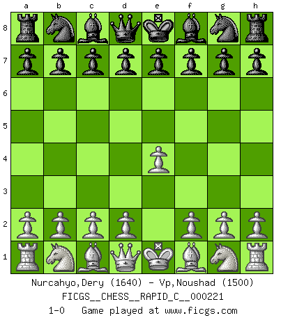 Last move : 1-0 2019 October 19 1:56:29 [Event "FICGS__CHESS__RAPID_C__000221"] [Site "FICGS"] [Date "2019.09.18"] [Round "1"] [White "Nurcahyo,Dery"] [Black "Vp,Noushad"] [Result "1-0"] [WhiteElo "1640"] [BlackElo "1500"] 1.e4 1-0 This chess game has been lost on time (started : 2019.09.18 9:36:4) King's pawn Opening Player White won this chess game. Follow this game move after move (download)I have never in my life played the French Defence, which is the dullest of all openings. (Wilhelm Steinitz) Kann Schach nicht schließlich das Nationalspiel der Deutschen werden? Und welche weiteren Ausblicke bieten sich dann dar! Welche Hebung des allgemeinen Kultur-Niveaus, ja der Moral, wenn das Schachbrett den Kartentisch verdrängen würde! Wahrlich, ein Ziel, des Schweißes der Edlen wert! (Siegbert Tarrasch) Antes de los Finales, los dioses han colocado el Juego Medio. (Siegbert Tarrasch) A chaque perte on perd un peu de soi. (Joël Lautier) Computers are like Old Testament gods; lots of rules and no mercy. (Joseph Campbell)