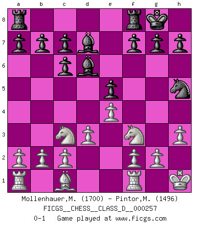 Last move : 0-1 2019 December 11 8:20:58 [Event "FICGS__CHESS__CLASS_D__000257"] [Site "FICGS"] [Date "2019.09.18"] [Round "1"] [White "Mollenhauer,Michael"] [Black "Pintor,Manuel"] [Result "0-1"] [WhiteElo "1700"] [BlackElo "1496"] 1.e4 e5 2.Nf3 Nc6 3.Bb5 Qf6 4.Bxc6 dxc6 5.O-O Bg4 6.h3 Bd7 7.d3 Bd6 8.Nc3 Qg6 9.Nh4 Qf6 10.Nf3 Qg6 11.Kh1 Qh5 12.Ng1 Nf6 13.Qxh5 Nxh5 14.Nf3 O-O 0-1 This chess game has been lost on time (started : 2019.09.18 12:28:7) Ruy Lopez (Spanish Opening) Kingside Castling by player White (move 5) Kingside Castling by player Black (move 14) Player Black won this chess game. Follow this game move after move (download)Chess makes man wiser and clear-sighted. (Vladimir Putin) Wenn ich mich einlogge, glauben die Leute gewöhnlich nicht, dass ich es selbst bin und sie fangen an, mir dumme Fragen zu stellen. Und wenn sie es glauben, stellen sie wieder andere dumme Fragen. (Judith Polgar) Fischer sacrificó virtualmente todo lo que la mayoría de nosotros los 'debiles' (término que él usa) valoramos, respetamos y apreciamos por el amor de un astuto, a menudo hermoso tablero de juego, por el privilegio ambivalente de ser su mas grande maestro. (Paul Kollar) Shah mat. Le roi est mort. Cri de fierté d'un joueur venant de terrasser son adversaire, courtoisement, sans effusion de sang. Train yourself to let go of everything you fear to lose. (Master Yoda in Star Wars ep.3)