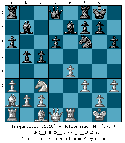 Last move : 1-0 2019 December 11 8:20:58 [Event "FICGS__CHESS__CLASS_D__000257"] [Site "FICGS"] [Date "2019.09.18"] [Round "1"] [White "Trigance,Emile"] [Black "Mollenhauer,Michael"] [Result "1-0"] [WhiteElo "1716"] [BlackElo "1700"] 1.a3 e5 2.e4 Nf6 3.Nc3 Nc6 4.Nf3 d6 5.d4 exd4 6.Nxd4 Nxd4 7.Qxd4 c5 8.Qd1 Be7 9.Bc4 O-O 10.O-O h6 11.Re1 a6 12.h3 b5 13.Ba2 Bb7 14.f3 1-0 This chess game has been lost on time (started : 2019.09.18 12:28:7) Anderssen's Opening Kingside Castling by player Black (move 9) Kingside Castling by player White (move 10) Player White won this chess game. Follow this game move after move (download)Man is a frivolous, a specious creature, and like a Chess player, cares more for the process of attaining his goal than for the goal itself. (Dostoyevsky) Irgendwie scheint mir sonntags früh um 9 Uhr der Killerinstinkt verloren gegangen zu sein. (Alexej Shirov) Cada Peón es una Reina en potencia. (James Mason) Vous n'êtes pas toujours obligé de jouer le meilleur coup. Un coup doit être actif, entreprenant, correct et beau ! (David Bronstein) The weakness of an artist is dogma. (Josh Waitzkin)