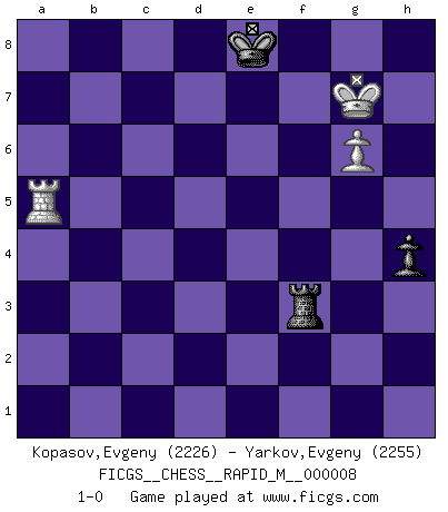 Last move : 1-0 2007 December 24 19:33:53 [Event "FICGS__CHESS__RAPID_M__000008"] [Site "FICGS"] [Date "2007.06.23"] [Round "1"] [White "Kopasov,Evgeny"] [Black "Yarkov,Evgeny"] [Result "1-0"] [WhiteElo "2226"] [BlackElo "2255"] 1.d4 d5 2.c4 c6 3.Nf3 Nf6 4.Nc3 dxc4 5.a4 Bf5 6.Ne5 e6 7.f3 c5 8.e4 Bg6 9.Be3 cxd4 10.Qxd4 Qxd4 11.Bxd4 Nfd7 12.Nxd7 Nxd7 13.Bxc4 a6 14.h4 h5 15.Rc1 Rc8 16.Ne2 Bb4+ 17.Kf2 e5 18.Be3 O-O 19.Rhd1 Nc5 20.b3 Ba3 21.Ra1 Bb4 22.Rd5 Rfe8 23.Kf1 Kf8 24.Rc1 f5 25.exf5 Bxf5 26.Ng3 Bg6 27.Ke2 Bf7 28.Bxc5+ Bxc5 29.Rd7 Bxc4+ 30.bxc4 Re7 31.Rd5 g6 32.Kd3 b6 33.Ne4 Ba3 34.Ra1 Bb4 35.Rb1 a5 36.Nf6 R8c7 37.Rd8+ Kf7 38.Nd5 Red7 39.Rxd7+ Rxd7 40.Ke4 Bc5 41.Kxe5 Rd6 42.Ke4 Rd8 43.Kd3 Re8 44.Rb2 Re1 45.Nxb6 Rd1+ 46.Ke4 Rd4+ 47.Ke5 Bxb6 48.Rxb6 Rxc4 49.Rb7+ Ke8 50.Ra7 Rxa4 51.Kf6 Rxh4 52.Rxa5 Rh2 53.g4 Re2 54.g5 Rf2 55.Kxg6 h4 56.Kg7 Rxf3 57.g6 1-0 QGD Slav : Wiesbaden variation Kingside Castling by player Black (move 18) 10 pieces endgame at move 50 : White KRPPP , Black KRPPP WHITE : King + 1 Rook 3 Pawns BLACK : King + 1 Rook 3 Pawns 9 pieces endgame at move 51 : White KRPP , Black KRPPP WHITE : King + 1 Rook 2 Pawns BLACK : King + 1 Rook 3 Pawns 8 pieces endgame at move 52 : White KRPP , Black KRPP WHITE : King + 1 Rook 2 Pawns BLACK : King + 1 Rook 2 Pawns 7 pieces endgame at move 55 : White KRPP , Black KRP WHITE : King + 1 Rook 2 Pawns BLACK : King + 1 Rook 1 Pawn 6 pieces endgame at move 56 : White KRP , Black KRP WHITE : King + 1 Rook 1 Pawn BLACK : King + 1 Rook 1 Pawn Player White won this chess game. Follow this game move after move (download)Though most people love to look at the games of the great attacking masters, some of the most successful players in history have been the quiet positional players. They slowly grind you down by taking away your space, tying up your pieces, and leaving you with virtually nothing to do ! (Yasser Seirawan) Wenn du nicht weißt was du tun sollst, warte bis dein Gegner eine Idee hat. Sie wird sicher schlecht sein. (Siegbert Tarrasch) No hay precio que no valga la pena por la cabellera del Rey enemigo. (Koblentz) Le succès, c'est être capable d'aller d'échec en échec sans perdre son enthousiasme. (Winston Churchill) There are two types of people in this world, good and bad. The good sleep better, but the bad seem to enjoy the waking hours much more. (Woody Allen)
