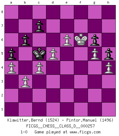 Last move : 1-0 2019 October 9 12:12:42 [Event "FICGS__CHESS__CLASS_D__000257"] [Site "FICGS"] [Date "2019.09.18"] [Round "1"] [White "Klawitter,Bernd"] [Black "Pintor,Manuel"] [Result "1-0"] [WhiteElo "1524"] [BlackElo "1496"] 1.d4 d5 2.Bf4 Bf5 3.e3 Nf6 4.Bd3 Bg4 5.f3 Bh5 6.g4 Bg6 7.Bxg6 fxg6 8.Qd3 e6 9.Nd2 Nc6 10.c3 Bd6 11.Bg3 O-O 12.Ne2 Na5 13.h4 Bxg3+ 14.Nxg3 Nc6 15.O-O e5 16.g5 Nh5 17.Nxh5 gxh5 18.Kg2 g6 19.Rf2 Qd7 20.Raf1 e4 21.Nxe4 dxe4 22.Qxe4 Rae8 23.Qd3 Qd5 24.c4 Qd7 25.b3 Ne5 26.Qe2 Ng4 27.fxg4 Qxg4+ 28.Qxg4 hxg4 29.Rxf8+ Rxf8 30.Rxf8+ Kxf8 31.Kg3 Kg7 32.Kxg4 h5+ 33.Kf4 Kf7 34.Ke5 Ke7 35.d5 a5 36.a4 b6 37.e4 Kd7 38.Kf6 Kd6 39.e5+ Kc5 40.e6 1-0 Queen's pawn, Mason variation Kingside Castling by player Black (move 11) Kingside Castling by player White (move 15) Player White won this chess game. Follow this game move after move (download)It is peculiar but a fact nevertheless, that gamblers in chess always have enthusiastic followers. (Botvinnik) Der Schachmeister von Heute braucht Courage, einen Killerinstinkt, Ausdauer und Arroganz. (Larry Evans) Ciertamente, de todas la drogas del mundo, el Ajedrez debe ser el mas placentero permamentemente. (Assiac) Les Echecs sont affaire de jugement sensible. Savoir quand frapper et quand esquiver. (Fischer) All the troubles of the world come from being unable to sit alone in a quiet room. (Blaise Pascal)